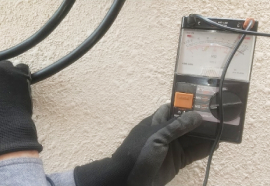 室内側では分電盤や電源コンセントと接続し、電圧チェックや通信テストを実施。